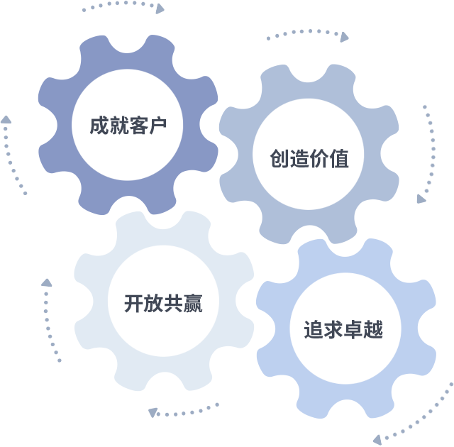成就客户是一切决策的出发点,,创造价值是衡量所有工作的标准,,,追求卓越是我们做事做人的态度,,,,开放共赢是我们的格局也是最终的结果。。价值观的齿轮环环相扣,,,,推动着组织里的每个人不断向前。。。。
